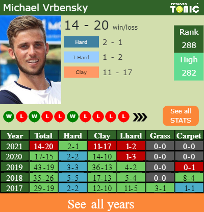 Vrbensky has a compiled 14-20 win-loss record in 2021, 11-17 on clay (See FULL STATS).