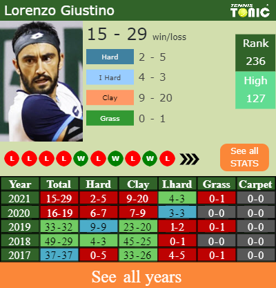 Lorenzo has an aggregate 15-29 win-loss record in 2021, 9-20 on clay (See FULL STATS).