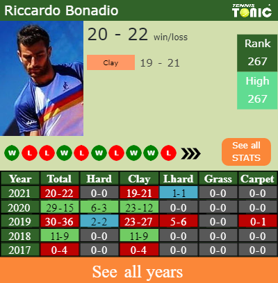 Riccardo has an aggregate 20-22 win-loss record in 2021, 19-21 on clay (See FULL STATS).