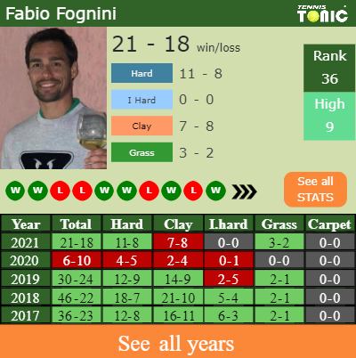 Fognini has a compiled 21-18 win-loss record in 2021, 11-8 on hard (See FULL STATS).