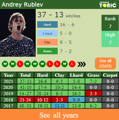Andrey has an overall 37-13 win-loss record in 2021, 16-6 on hard (See FULL STATS).