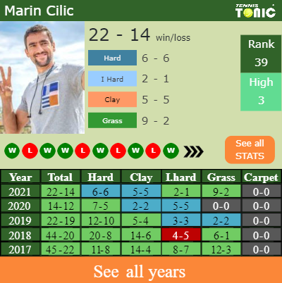 Cilic has an aggregate 22-14 win-loss record in 2021, 6-6 on hard (See FULL STATS).