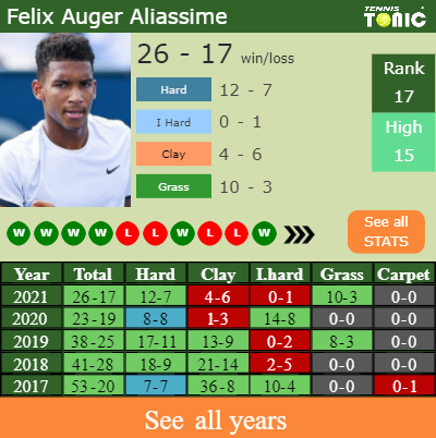 The Canadian has a composed 26-17 win-loss record in 2021, 12-7 on hard (See FULL STATS).