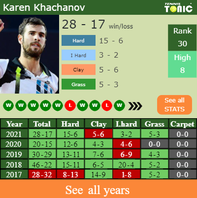 Karen has a compiled 28-17 win-loss record in 2021, 15-6 on hard (See FULL STATS).