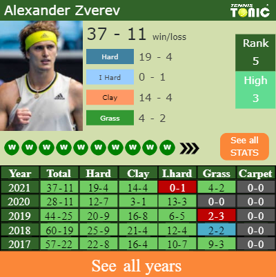 Zverev has a composed 37-11 win-loss record in 2021, 19-4 on hard (See FULL STATS).