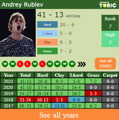 Rublev has a compiled 41-13 win-loss record in 2021, 20-6 on hard (See FULL STATS).