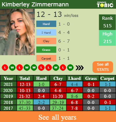 Kimberley has an aggregate 12-13 win-loss record in 2021, 1-0 on hard (See FULL STATS).