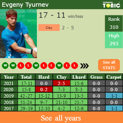 Talking about his overall career, Tyurnev has an overall 208-128 record. He has a positive 67-46 record on clay.
