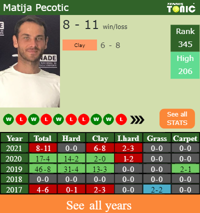 Matija has an overall 8-11 win-loss record in 2021, 6-8 on clay (See FULL STATS).