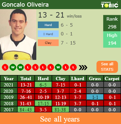 The Portuguese has a compiled 13-21 win-loss record in 2021, 7-15 on clay (See FULL STATS).