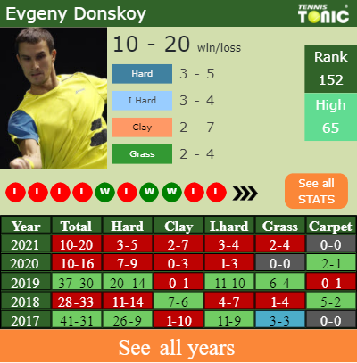 Talking about his overall career, Evgeny has an overall 456-375 record. He has a positive 195-130 record on hard.