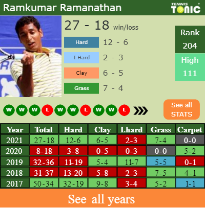 In terms of his career, Ramkumar has an overall 336-255 record. He has a positive 214-139 record on hard.