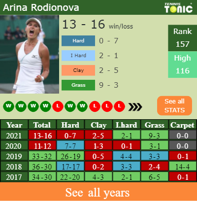 Rodionova has an aggregate 13-16 win-loss record in 2021, 0-7 on hard (See FULL STATS).