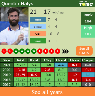 Quentin has a compiled 21-17 win-loss record in 2021, 7-4 on hard (See FULL STATS).