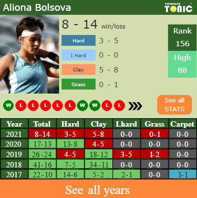 Bolsova has a composed 8-14 win-loss record in 2021, 3-5 on hard (See FULL STATS).