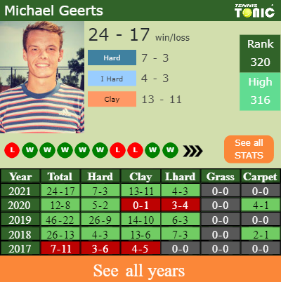 Geerts has a solid match record in the last 8 years having won 60% of his matches (225-147). 13-11 on clay in 2021. Regarding his performance on the same surface of this event, Geerts has an aggregate75-58 record in the last 8 years on clay.