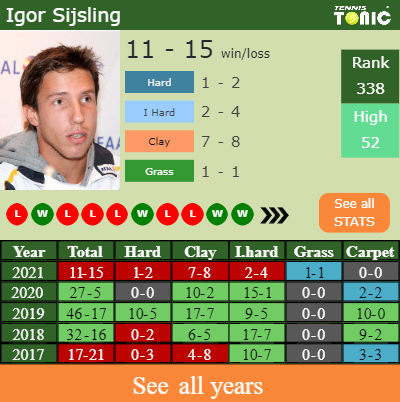 Sijsling has a favorable win-loss record in the last 10 years having won 58% of his matches (300-217). 7-8 on clay in 2021. Talking about his performance on the same surface of this event, Sijsling has an aggregate 82-72 win-loss record in the last years on clay.