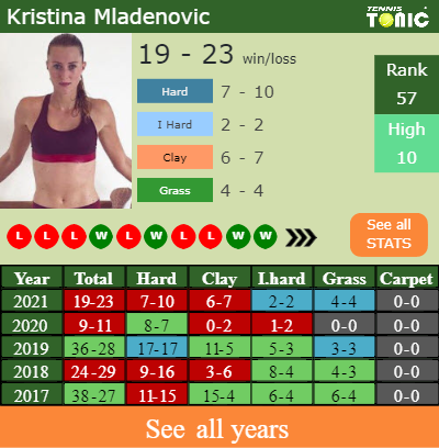 This will be the 3rd time that Elina Svitolina and Kristina Mladenovic square off. The head to head is 2-0 for Mladenovic (see full H2H stats), 1-0 on hard.