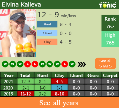 Elvina has an overall 12-9 win-loss record in 2021, 8-4 on hard (See FULL STATS).