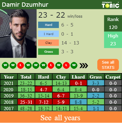 Dzumhur has an overall 23-22 win-loss record in 2021, 6-5 on hard (See FULL STATS).