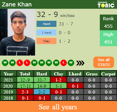 Zane has a composed 32-9 win-loss record in 2021, 31-7 on hard (See FULL STATS).