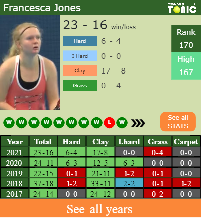 Jones has an aggregate 23-16 win-loss record in 2021, 6-4 on hard (See FULL STATS).