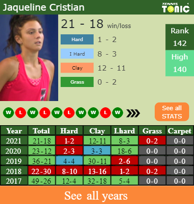 Cristian has a solid record in the last 7 years having won 60% of her matches (207-136). 1-2 on hard in 2021. In connection with her performance on the same surface of this competition, Cristian has a composed64-37 win-loss record in the last 7 years on hard.