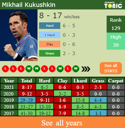Kukushkin has a positive record in the last 10 years having won 53% of his matches (268-239). 6-5 on hard in 2021. Regarding his performance on the same surface of this tournament, Kukushkin has an aggregate 119-90 record in the last years on hard.