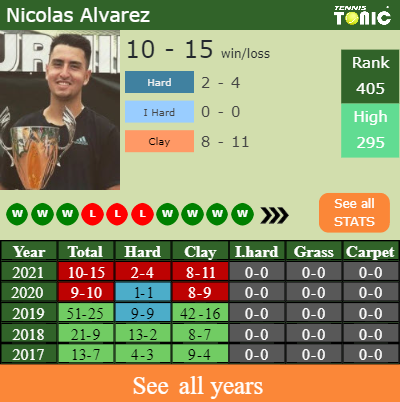 Nicolas has a compiled 10-15 win-loss record in 2021, 8-11 on clay (See FULL STATS).