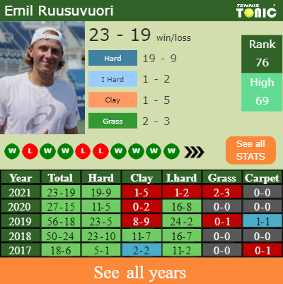 The Finn has an aggregate 23-19 win-loss record in 2021, 19-9 on hard (See FULL STATS).