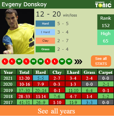 Evgeny has an overall 12-20 win-loss record in 2021, 5-5 on hard (See FULL STATS).