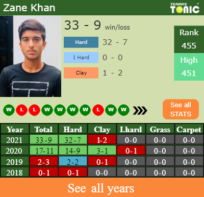 Zane has a compiled 33-9 win-loss record in 2021, 32-7 on hard (See FULL STATS).