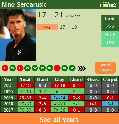 Serdarusic has a winning match record in the last 7 years having won 57% of his matches (270-201). 17-18 on clay in 2021. Talking about his performance on the same surface of this competition, Serdarusic has a compiled235-146 record in the last 7 years on clay.