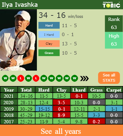 Ivashka has a solid record in the last 9 years having won 62% of his matches (314-192). 11-5 on hard in 2021. Talking about his performance on the same surface of this event, Ivashka has a composed175-96 match record in the last 9 years on hard.