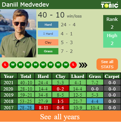 Daniil has an aggregate 40-10 win-loss record in 2021, 24-4 on hard (See FULL STATS).