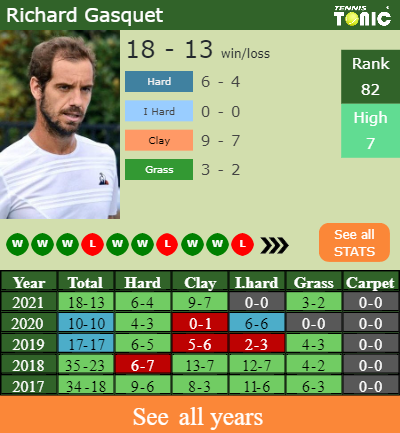 The French player has an aggregate 18-13 win-loss record in 2021, 6-4 on hard (See FULL STATS).