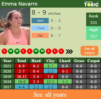 Navarro has a composed 8-9 win-loss record in 2021, 0-2 on hard (See FULL STATS).