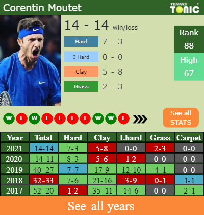 The French player has an aggregate 14-14 win-loss record in 2021, 7-3 on hard (See FULL STATS).