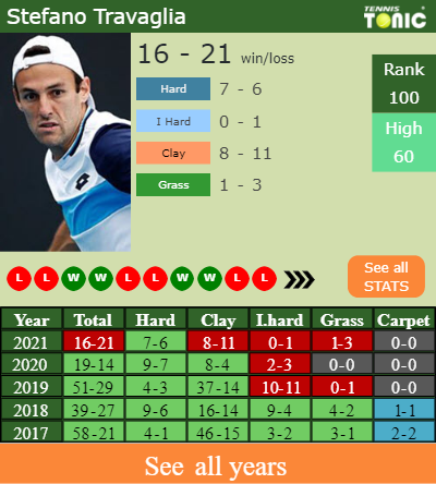 In terms of his career, Travaglia has an overall 396-211 record. He has a positive 41-31 record on hard.