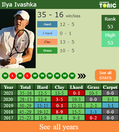 Ilya has an aggregate 35-16 win-loss record in 2021, 12-5 on hard (See FULL STATS).