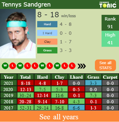 Sandgren has an aggregate 8-18 win-loss record in 2021, 4-8 on hard (See FULL STATS).