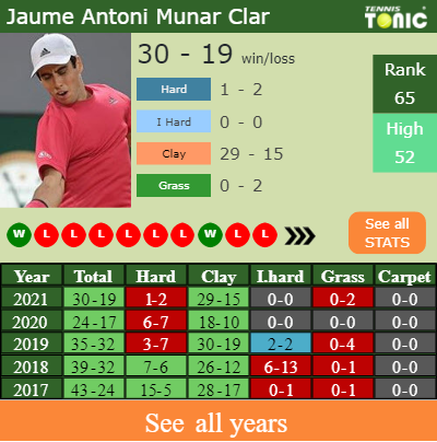 Jaume Antoni has an aggregate 30-19 win-loss record in 2021, 1-2 on hard (See FULL STATS).