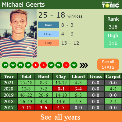 Geerts has a solid win-loss record in the last 8 years having won 60% of his matches (226-148). 8-3 on hard in 2021. Regarding his performance on the same surface of this tournament, Geerts has a composed121-67 win-loss record in the last 8 years on hard.
