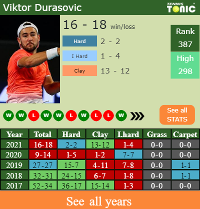 Durasovic has an overall 16-18 win-loss record in 2021, 2-2 on hard (See FULL STATS).