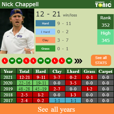 Chappell has a compiled 12-21 win-loss record in 2021, 9-11 on hard (See FULL STATS).