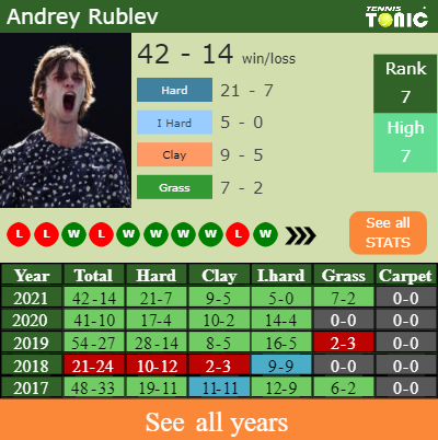 Rublev has a solid match record in the last 9 years having won 64% of his matches (317-181). 21-7 on hard in 2021. Regarding his performance on the same surface of this event, Rublev has a compiled119-64 record in the last 9 years on hard.