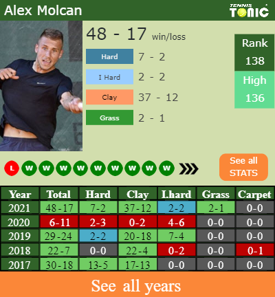 Alex has an aggregate 48-17 win-loss record in 2021, 7-2 on hard (See FULL STATS).