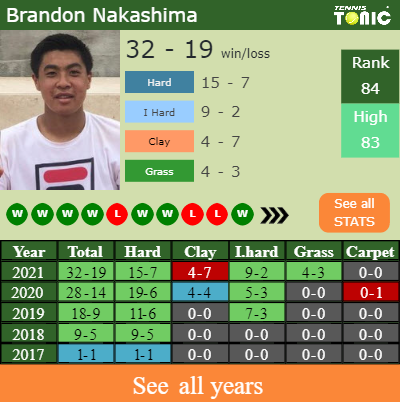 Nakashima has an overall 32-19 win-loss record in 2021, 15-7 on hard (See FULL STATS).