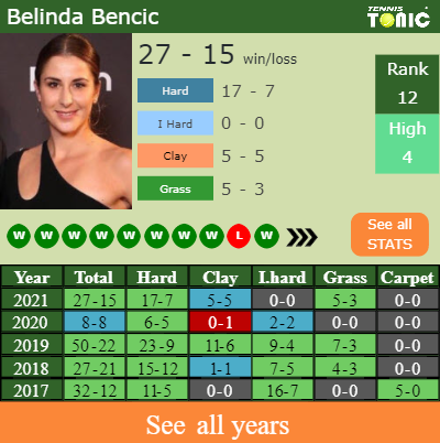 Bencic has an aggregate 27-15 win-loss record in 2021, 17-7 on hard (See FULL STATS).