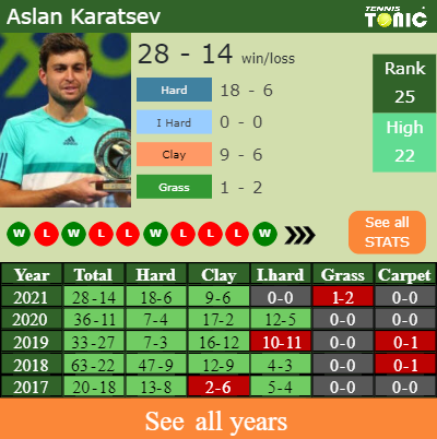 Karatsev has a composed 28-14 win-loss record in 2021, 18-6 on hard (See FULL STATS).